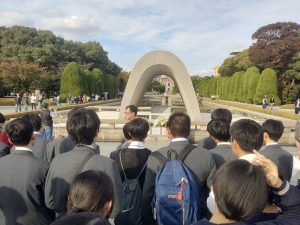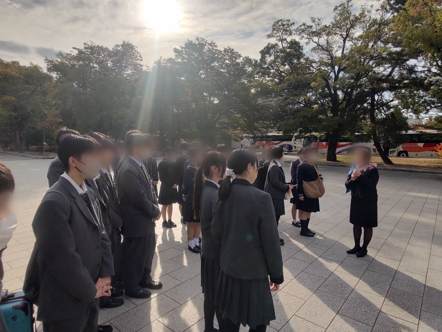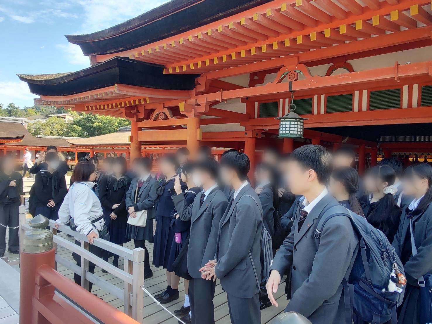 【2年生】修学旅行2日目 -平和と信仰に学ぶ- 2025/11/06 ブログ, 学校行事 修学旅行二日目は、歴史と祈りに満ちた宮島・広島を訪れました。 午前中は世界遺産「厳島神社」を参拝。海に浮かぶ大鳥居を前に、自然と人が調和して生きる日本の文化に触れました。静かな社殿で手を合わせながら、一人ひとりが日々の学びに感謝し、これからの成長を誓いました。 午後は「広島平和記念資料館」にて平和学習を行いました。原爆の惨禍を伝える展示に真摯に向き合い、原爆の悲惨さと平和の尊さを深く学び、一人ひとりが「未来をつくる責任」について考える貴重な時間となりました。 学んだことを自らの生き方へと結びつける――それが吉田松陰先生が説かれた「知行合一」の実践であることを改めて感じました。