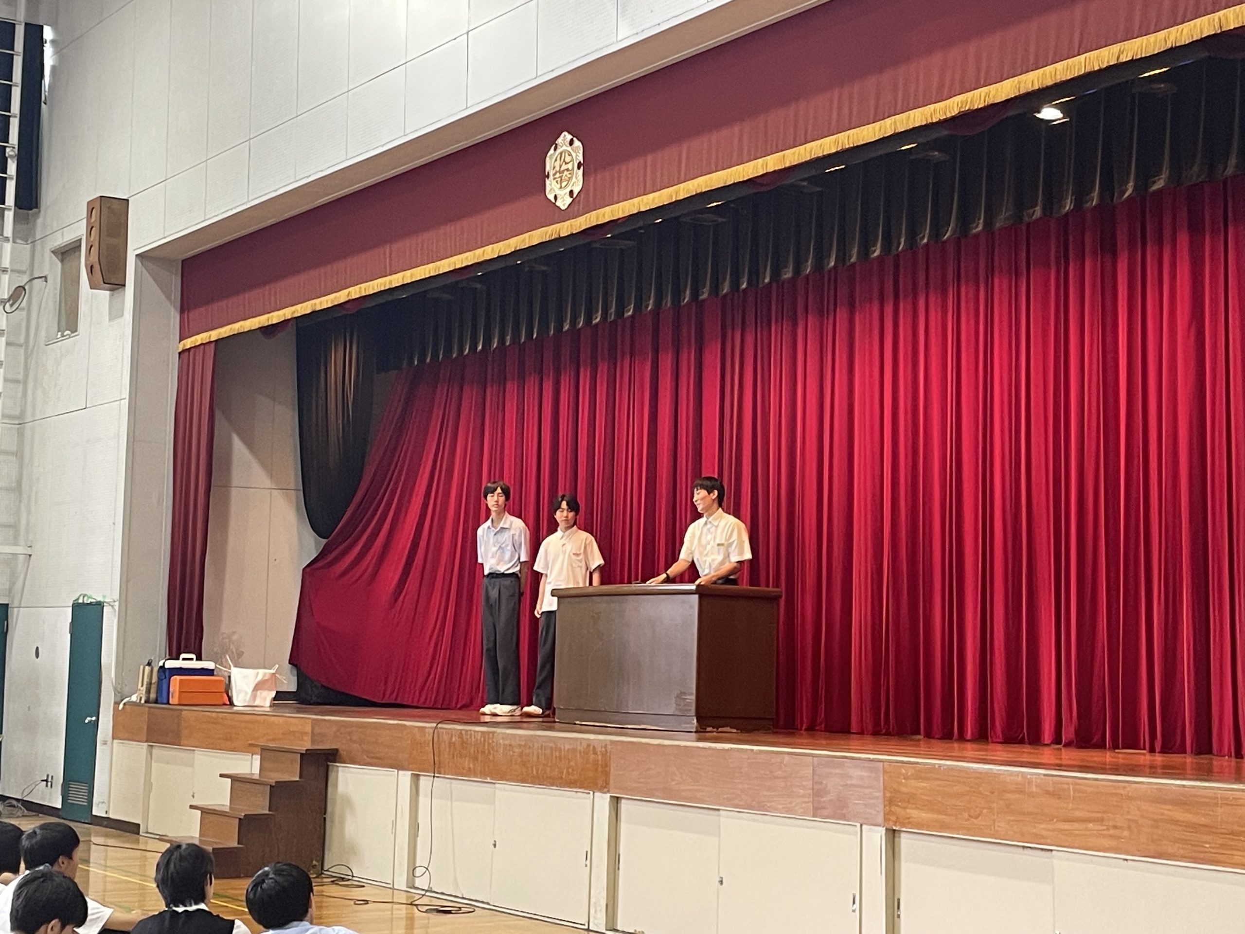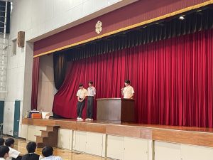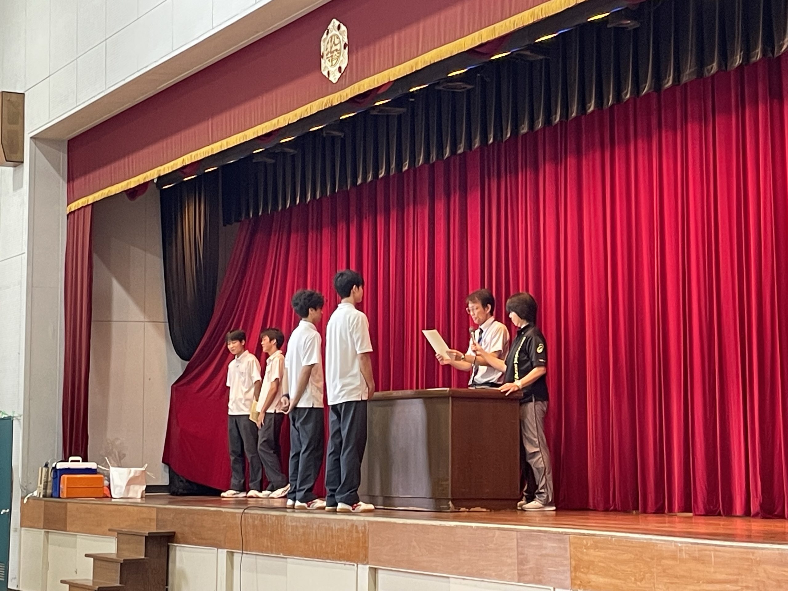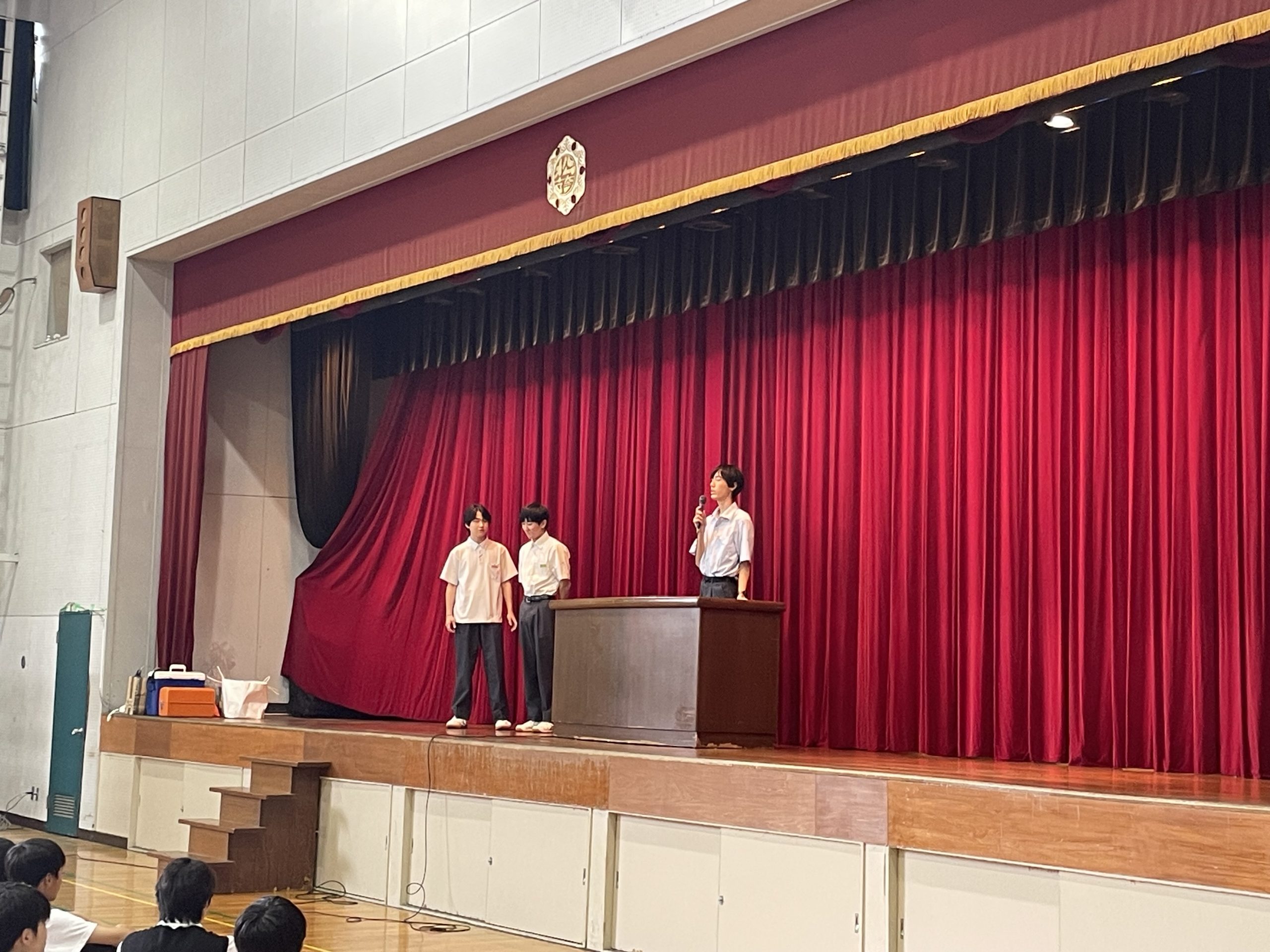 後期始業式を行いました。 2025/10/02 ブログ, 学校行事 本日、後期始業式が行われました。新しい学期を迎え、生徒たちの表情からも、気持ちを新たに取り組もうとする姿勢が感じられました。 式後には、9月30日に実施された球技大会の表彰が行われました。会場は温かい拍手に包まれ、充実した学期のスタートとなりました。 さらに、生徒会より生徒会役員選挙の結果発表も行われました。新しい役員は、会長に粂田くん、副会長に野島くん・黄野くんが就任しました。旧会長の杉浦さんからの激励の言葉、新役員による挨拶があり、生徒たちは新体制での学校生活に大きな期待を寄せていました。