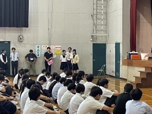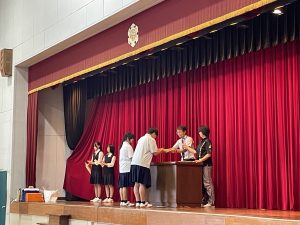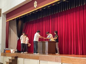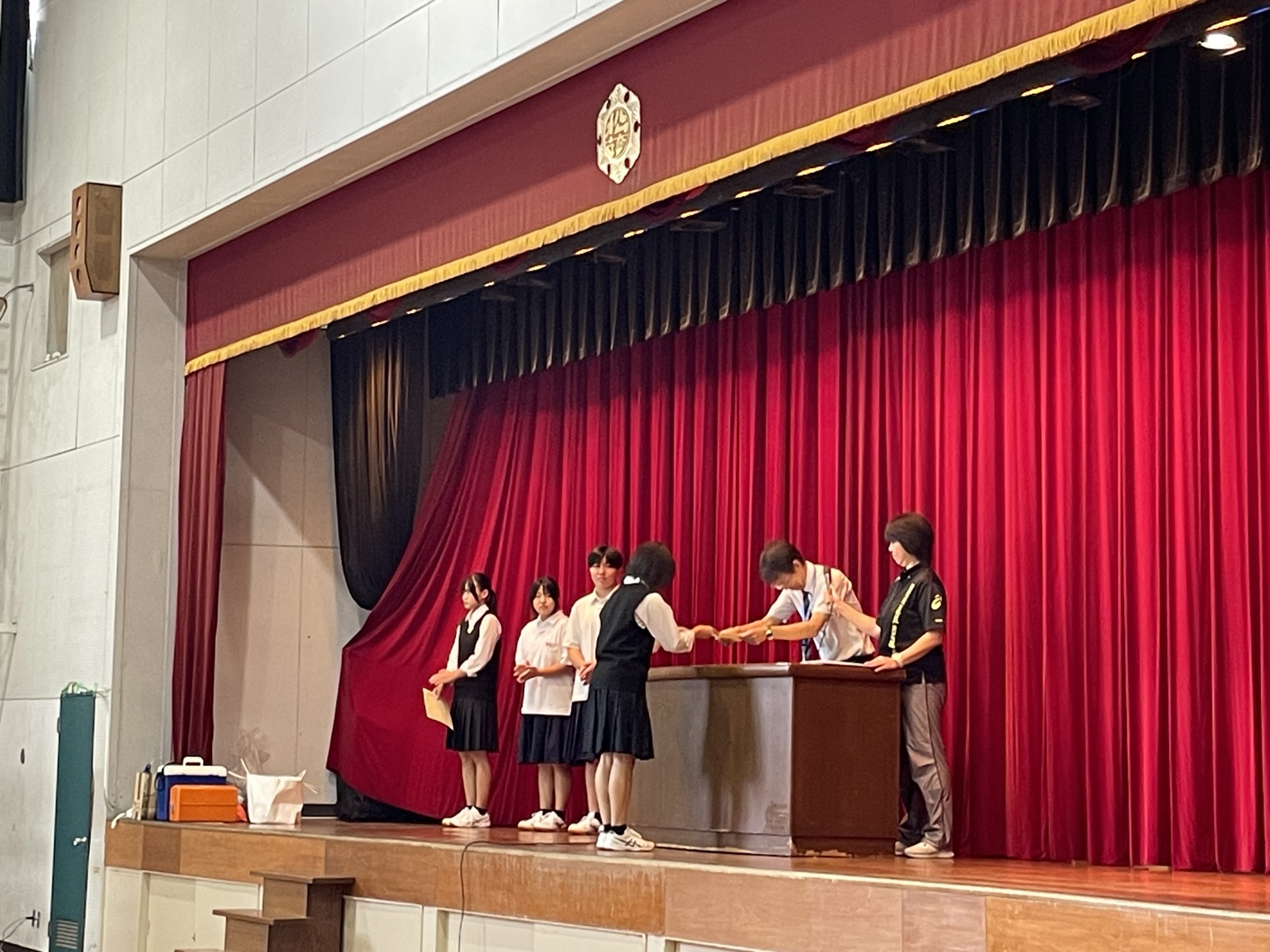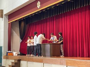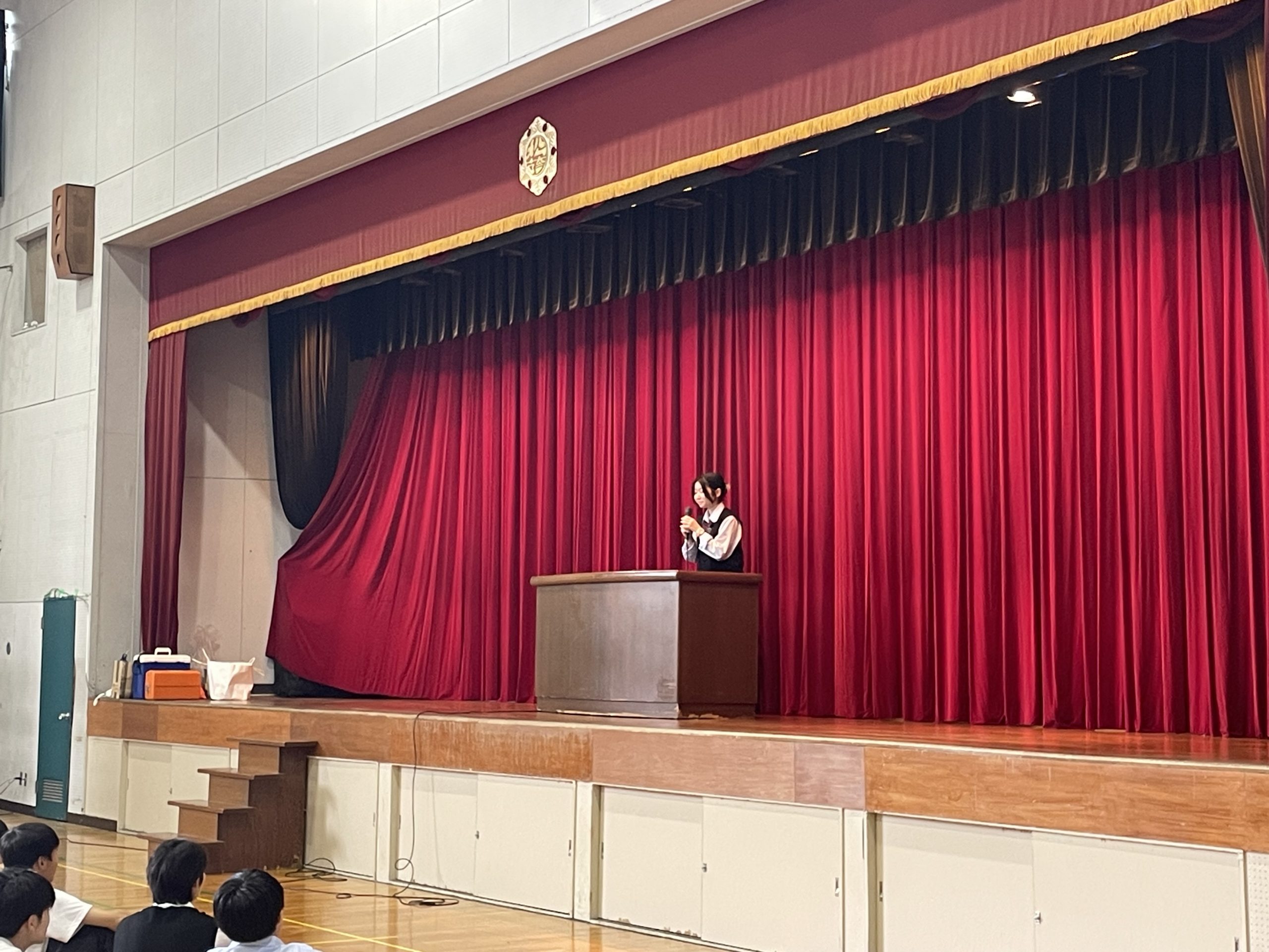 後期始業式を行いました。 2025/10/02 ブログ, 学校行事 本日、後期始業式が行われました。新しい学期を迎え、生徒たちの表情からも、気持ちを新たに取り組もうとする姿勢が感じられました。 式後には、9月30日に実施された球技大会の表彰が行われました。会場は温かい拍手に包まれ、充実した学期のスタートとなりました。 さらに、生徒会より生徒会役員選挙の結果発表も行われました。新しい役員は、会長に粂田くん、副会長に野島くん・黄野くんが就任しました。旧会長の杉浦さんからの激励の言葉、新役員による挨拶があり、生徒たちは新体制での学校生活に大きな期待を寄せていました。